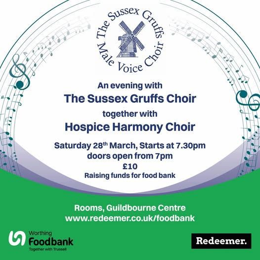 The concert is raising money for Worthing Foodbank, and the choirs will perform a wide variety of music including show tunes, music from films, popular songs, folk, and jazz. There will be a fully licensed bar available. Access is via High Street Multi Storey Car park - level 2. To buy tickets please click here and scroll down the page. To view the location of the venue, please click on: - The Rooms, Guildborne Centre, Worthing
